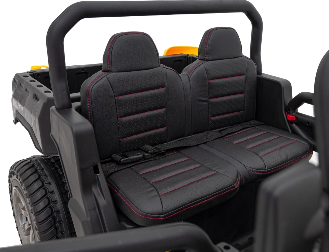 Krachtige elektrische kinder pick-up met 4x4-aandrijving, 12 V / 10 Ah accu en EVA-schuimbanden voor comfortabel rijden. Voorzien van 2,4 GHz afstandsbediening met veiligheidsfunctie Stop, soepele start, realistische LED-koplampen en een elektrisch bedienbare kiepbak met te openen achterklep. Tweezits stoel van eco-leer, multimediasectie MP3/SD/AUX en geluiden in het stuur voor nog meer rijplezier.