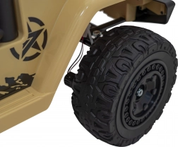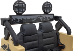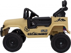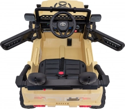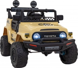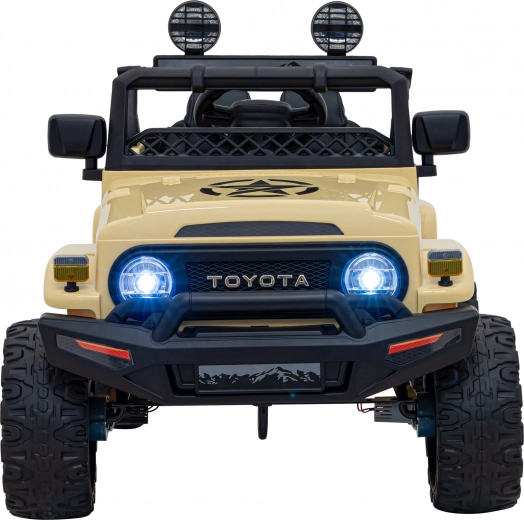 Stijlvolle kinderauto Toyota FJ Cruiser in beige met 4x4-aandrijving, stille EVA-wielen, LED-verlichting en 2,4 GHz afstandsbediening voor veilig rijden. Dankzij het audiopaneel met MP3/USB/Bluetooth, de comfortabele eco-lederen zitting en de softe start is het de ideale keuze voor leuke en veilige ritjes in de tuin en in het park.