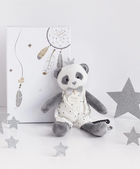 Een schattige pluchen panda uit de Doudou-cadeauset die baby’s vanaf de geboorte zal verrukken. Gemaakt van zacht premium pluche, biedt tederheid, comfort en een rustgevende knuffel, is geschikt vanaf de geboorte en voldoet aan de Europese CE-normen. Een geweldig cadeautip – gepresenteerd in een elegante geschenkdoos.