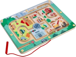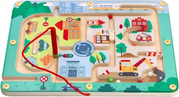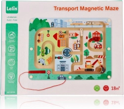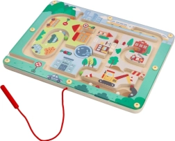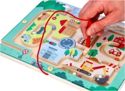 Ontdek de leuke wereld met Magnetisch labyrint Voertuigen, dat is ontworpen om de denk- en vaardigheidsontwikkeling van kleine handen te stimuleren. Dit speelgoed is gemaakt van hoogwaardig hout en toont een kleurrijke stadsscène met wegen, gebouwen en voertuigen. Met behulp van de rode magnetische staaf begeleiden kinderen kleine balletjes langs het pad, wat hun fijne motoriek en oog-handcoördinatie bevordert.