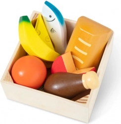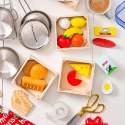 Deze houten voedingsset bevat vier kleine doosjes die verschillende etenswaren verbergen zoals melk, kaas en brood. Het is ontworpen voor creatief spel, waarmee kinderen hun fijne motoriek en verbeeldingskracht kunnen ontwikkelen.