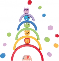 Deze veelzijdige houten stapelset biedt eindeloze speelmogelijkheden. Kinderen kunnen torens, bruggen en banen bouwen met gekleurde bogen, het evenwicht met diertjes uitproberen en hun concentratie trainen. De combinatie van regenboog-halve cirkels en figuurtjes stimuleert de creativiteit en leert kinderen logisch denken en ruimtelijke verbeelding.