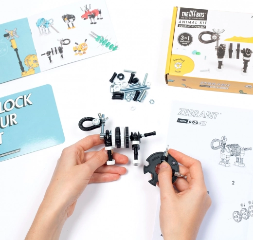 Ontdek de speelse bouwset The OffBits ZebraBit, waarmee je van metalen en kunststof onderdelen tot drie verschillende modellen en eindeloze eigen variaties kunt bouwen. Inclusief universeel gereedschap, eenvoudige handleiding en onderdelen die compatibel zijn met alledaagse voorwerpen uit het huishouden. Stimuleert creativiteit, fijne motoriek, logisch denken en interesse in STEAM (science, technologie, engineering, kunst en wiskunde). Geschikt vanaf 6 jaar.