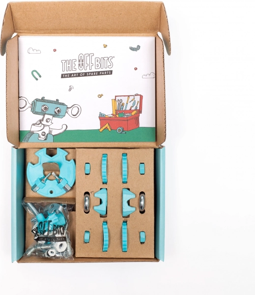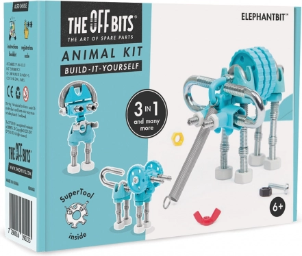 De bouwset THE OFFBITS ElephantBit brengt plezier en leren samen. Dankzij de slimme combinatie van schroeven, moeren, U-bouten, veren en gevormde kunststof connectoren kunnen kinderen een Olifant, Hond of Robot bouwen – en daarna eigen, originele constructies uitproberen. Het modulaire systeem stimuleert geduld, precisie en ruimtelijk inzicht.