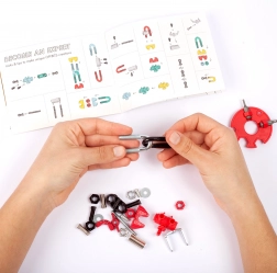 Onderdelen zijn creatief te combineren met karton, schroefjes en andere alledaagse voorwerpen, waardoor de bouwmogelijkheden praktisch onbeperkt zijn. Met het meegeleverde multifunctionele gereedschap verloopt de montage eenvoudig en veilig – ideaal voor beginnende bouwers.