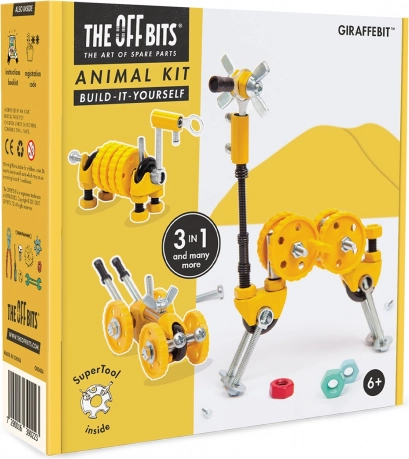 GiraffeBit neemt je mee van de grond tot in de wolken. Met een originele combinatie van schroeven, moeren en speciaal gevormde onderdelen bouw je een giraffe, een gordeldier of een raceauto – en daarna alles wat je fantasie toelaat. Dankzij de compatibiliteit met alledaagse voorwerpen kun je de set uitbreiden met bijvoorbeeld karton en andere materialen om volledig unieke uitvindingen te maken.