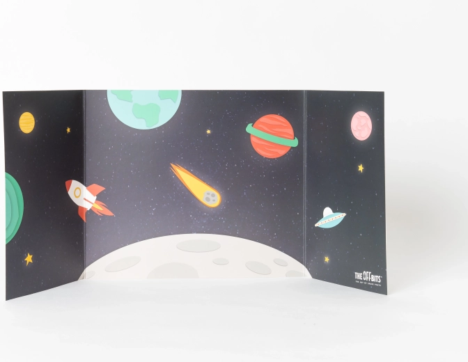 Een opvouwbare kartonnen achtergrond met kosmosthema creëert een indrukwekkende setting voor het spelen en fotograferen van voltooide modellen. De stabiele driedelige constructie vergroot de speelwereld.