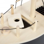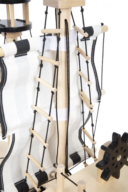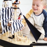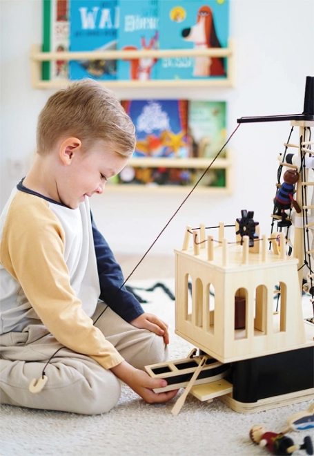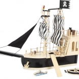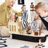 Inbegrepen is een uitgebreide set accessoires: twee beweeglijke piraten (geschikt voor figuren tot 12 cm), een boot voor tochten naar de kust, een haai voor spannende achtervolgingen, een papegaai, een schatkist, twee vaten, een plank, een vlag en een werkend houten kanon met drie vilten kogels. Reling en masten kunnen eenvoudig worden verwijderd voor ruimtebesparende opslag.