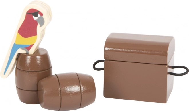 Twee beweeglijke piraten, een boot, een schatkist, vaten, een plank, een vlag, een papegaai en een haai – complete uitrusting voor eindeloze avonturen.