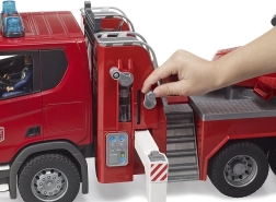 Ontdek de fascinerende wereld van de brandweer met de Scania brandweerwagen, uitgerust met alle essentiële details voor realistisch spel. De kinderbrandweerauto biedt diverse bewegende delen zoals inklapbare spiegels, een navulbare tank en een houder voor de watersproeier op de ladderkooi.