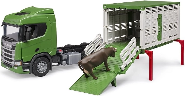 De realistische BRUDER dierentransporter op SCANIA-chassis zal jonge boeren verblijden met geweldige functies en een robuuste afwerking. Hij biedt kantelbare en uitschuifbare laadkleppen, te openen deuren, inklapbare spiegels en interne verdeelhekken. Inclusief koe-figuur, zachte bandprofielen voor stille ritten en de mogelijkheid om uit te breiden met een licht- en geluidsmodule voor nog meer speelplezier.