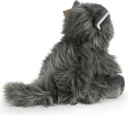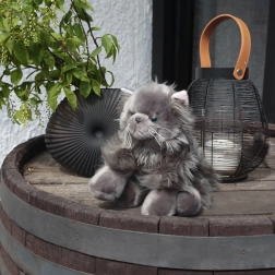 Lange, superzachte grijze pluche, blauwe ogen en roze oortjes maken van de kat een trouwe knuffel én een mooie decoratie.