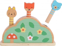 Dit duurzame en mooi geïllustreerde houten pop-up speelgoed biedt kinderen vanaf 12 maanden veel plezier en leermomenten. De basis met kleurrijke illustraties en drie dierfiguurtjes op veertjes nodigen uit tot herhaaldelijk indrukken, plaatsen en ontdekken. Het spel bevordert op natuurlijke wijze de ontwikkeling van fijne motoriek, coördinatie, herkenning van kleuren en vormen en geduld.