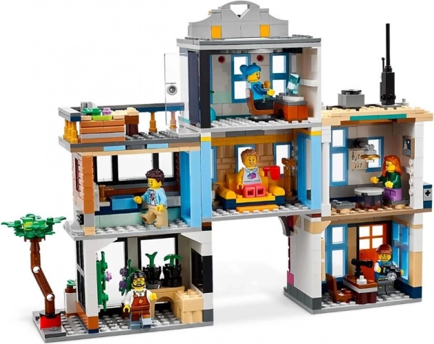 Lego Creator Hoofdstraat biedt drie bouwmogelijkheden in één doos. Bouw een hoofdstraat met vier gebouwen, transformeer deze in een vierlaagse art-decoappartementswoning met een park, of in een winkelstraat met studio en bloemenwinkel. De set bevat zes minifiguren voor speelse verhalen.