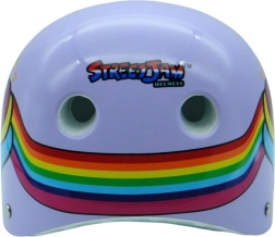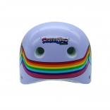 Stijlvolle paarse helm met eenhoornmotief voor fiets, skateboard en inline skates. Biedt 9 ventilatieopeningen, een versterkte polymeerbuitenschaal, EPS-schuim en certificering EN 1078:2027 voor betrouwbare bescherming.