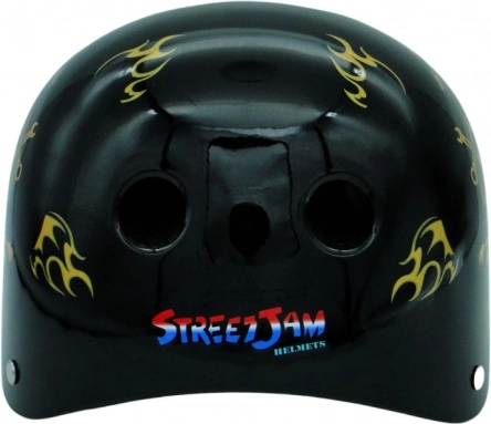 Stijlvolle helm met schedelmotief in zwart-goud die beschermt tijdens fietsen, skateboarden en inline skaten. Biedt 9 ventilatieopeningen, een slagbestendige verstevigde buitenschaal en een kwalitatieve EPS-voering voor maximale veiligheid en comfort. Voldoet aan de norm EN 1078:2029. Maat S (52–55 cm).