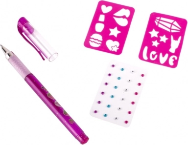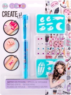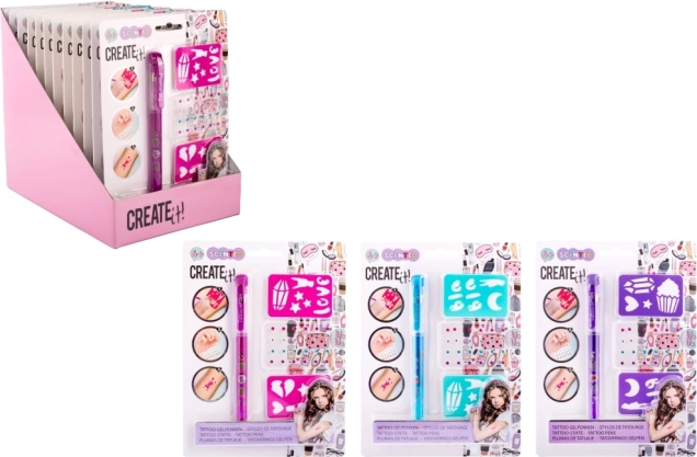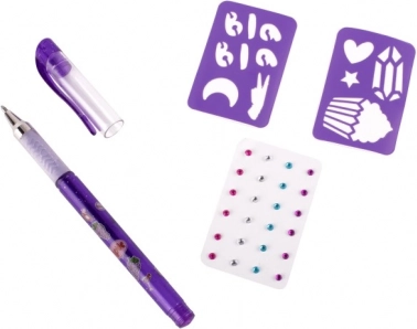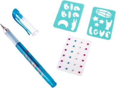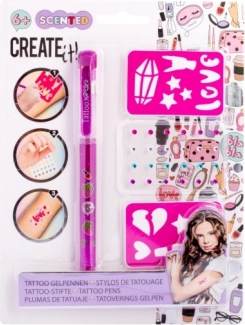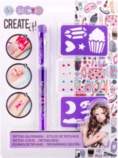 Tattooset met geurende gelpen – de set bevat een geurende gel-tattoo pen in 3 verschillende kleuren, zelfklevende glinstersteentjes en twee sjablonen.