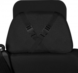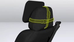 Eenvoudige bevestiging aan de hoofdsteun met een verstelbare riem en gesp. De 360 graden draaikoppeling maakt elke positie mogelijk.