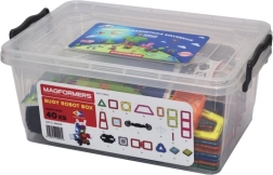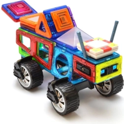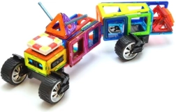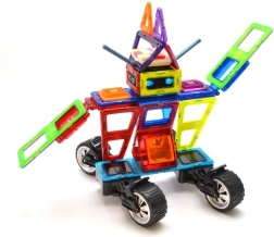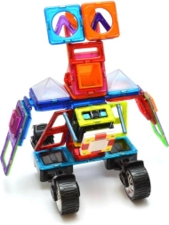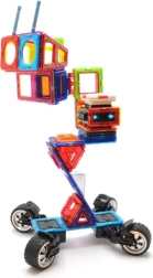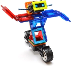 De box is ideaal voor het bouwen van rijdende robots met vrij verstelbare armen, maar ook motorfietsen, trucks en aanhangers. Drie driehoekige opzetstukken en een rijke set rechthoeken helpen stevige frames in hoogte en lengte te creëren. Kinderen oefenen met magnetische verbindingen en ontwikkelen fantasie, ruimtelijk inzicht en fijne motoriek. De onderdelen zijn veilig, duurzaam en compatibel met GEOMAG.
