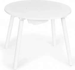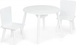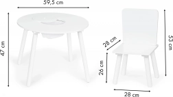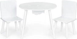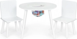 Stijlvolle en praktische kinderset van ECOTOYS met een ronde witte tafel en twee stoeltjes. Voorzien van stevige poten van grenenhout, een duurzaam MDF‑blad en een slim ingebouwd netopbergvak onder het deksel voor snel opruimen. Ideaal om te leren, spelen en zelfstandig te tafelen in de kinderkamer of speelhoek.