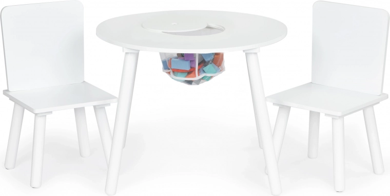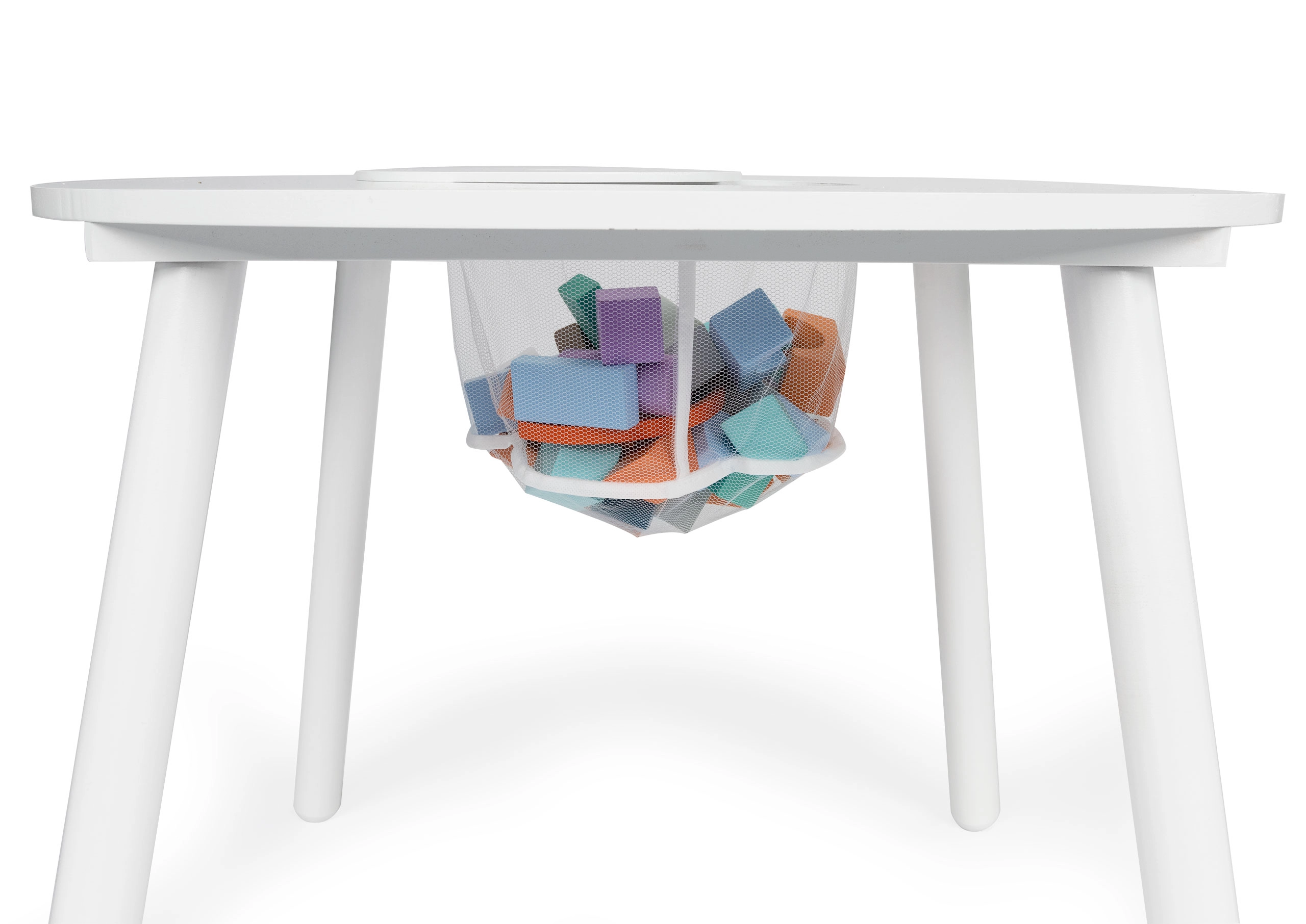 Het praktische opklapbare deksel in het midden verbergt een netmand waarin kinderen blokken, potloden of klein speelgoed in een handomdraai kunnen opbergen. De set past perfect in moderne interieurs in Scandinavische stijl en is ideaal voor kinderkamers, speelruimtes en wachtruimtes.