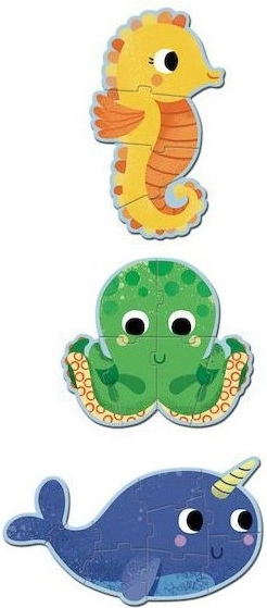 Kindercontourpuzzels met drie onderwaterdiertjes: een zeepaardje, een octopus en een narwal.