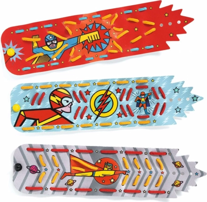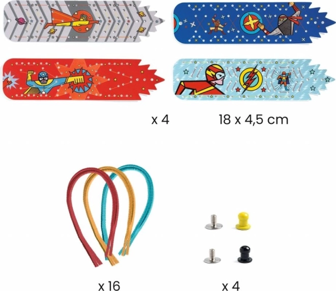 Met deze creatieve set van DJECO ontwerpen en maken kinderen tot vier stijlvolle armbanden met een superheldenthema. Dankzij de voorgeboorde onderdelen is het maken intuïtief en leuk – rijg de koorden eenvoudig door de markeringen op de armbandjes en volg de meegeleverde instructies. Zacht suède koord en elementen van synthetisch leer zorgen voor prettig draagcomfort.