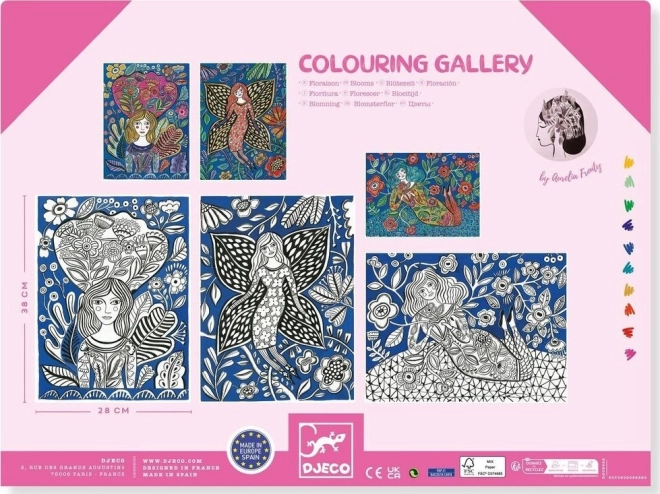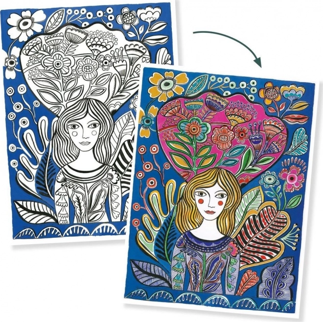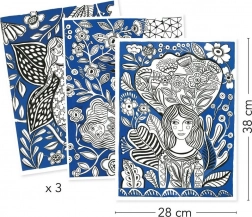 De set bevat 3 artistieke motieven van ongeveer 28 × 38 cm, klaar om na het inkleuren een originele decoratie te worden.