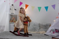Dit bruine schommelpaard is gemaakt van kwalitatief, heerlijk zacht pluche dat uitnodigt om te knuffelen en veilig te spelen. De realistische afwerking met teugel, zadel en stijgbeugels prikkelt de verbeelding en tovert elke kamer om tot een kleine ranch.