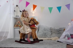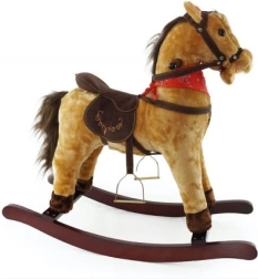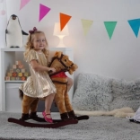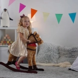 De interactieve bediening is eenvoudig – druk op één van de oortjes en het paardje laat typisch gehinnik of drafgeluid horen. Stevige houten sleden en handgrepen bieden zekerheid tijdens het schommelen, terwijl de rode sjaal het speelgoed een stijlvolle touch geeft.