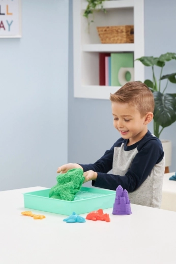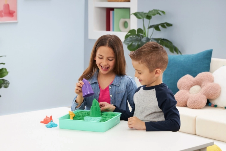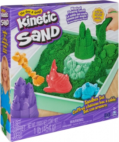 Ontdek de magie van sensorisch spel met het originele zand KINETIC SAND in een praktische tafelset met dienblad. Het droogt niet uit, is makkelijk te vormen en plakt niet aan de handen, zodat kinderen keer op keer kastelen, dieren en hun eigen werelden kunnen bouwen. Inclusief 454 g groen zand, vormpjes en een schep – ideaal voor creatief spelen zonder rommel, zowel binnen als buiten.