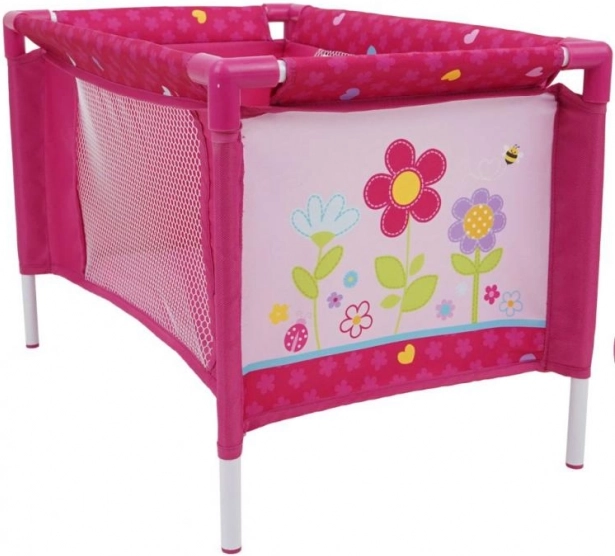 Ademende gaaszijwanden, roze frame en bloemdecor. Het bedje is licht en gemakkelijk te vervoeren – ideaal voor op reis en om poppen te laten slapen.