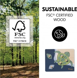 Het speelgoed is gemaakt van FSC-gecertificeerd hout, dus vriendelijk voor de natuur en stevig voor dagelijks gebruik. Het zachte palet van groene en blauwe tinten wekt nieuwsgierigheid en werkt tegelijk rustgevend.