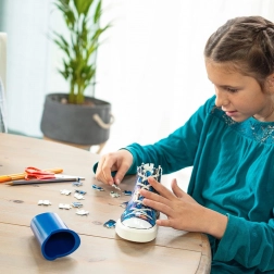 Tijdens het puzzelen trainen kinderen hun geduld, logisch denken en fijne motoriek. De afgewerkte sneaker verandert in een houder voor pennen, kleurpotloden en scharen, zodat de vreugde over het resultaat elke dag blijft.