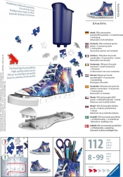 RAVENSBURGER 3D-puzzel sneaker space combineert creatieve fun met praktisch gebruik. Dankzij de precies passende, duurzame stukjes kunnen kinderen zonder lijm een stabiel model bouwen dat zowel een blikvanger als een nuttige toevoeging aan de kinderkamer is. Het kosmische design in blauw-paars tinten prikkelt de fantasie en de nieuwsgierigheid naar de wereld van ontdekking.