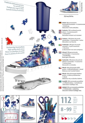 108 stevige stukjes met kosmische graphics vormen samen de aantrekkelijke vorm van een sneaker. Een geweldige uitdaging voor jonge bouwers en beginnende 3D-puzzelfans.