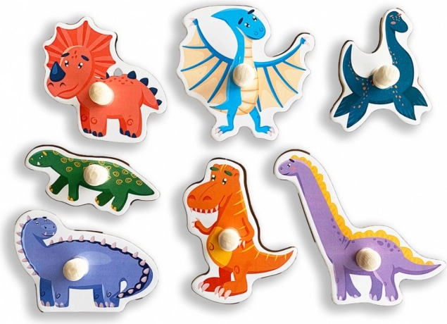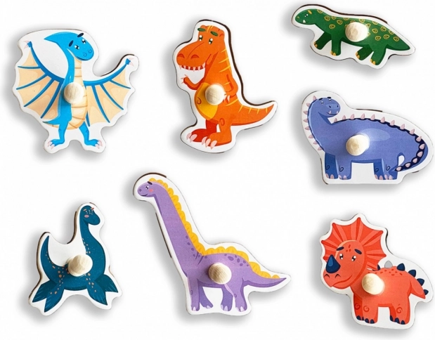 Kleurige houten puzzel met dinosaurussen voor de allerkleinsten ondersteunt de fijne motoriek, oog-handcoördinatie en herkenning van vormen en kleuren. Zeven stukjes met praktische knopjes worden in precies gefreesde uitsparingen op het bord geplaatst, wat het hanteren makkelijker maakt en zowel het logisch denken als het visuele geheugen ontwikkelt.