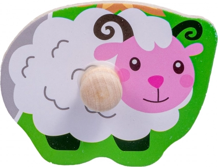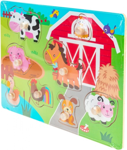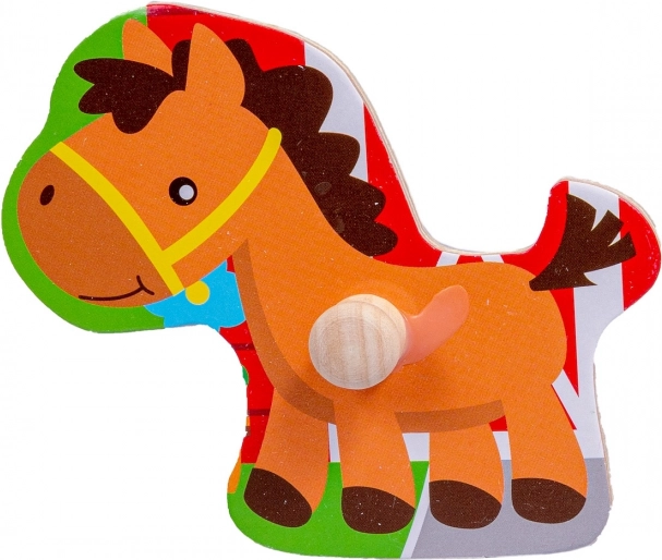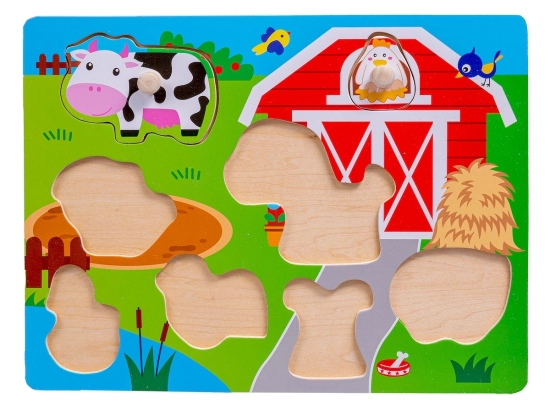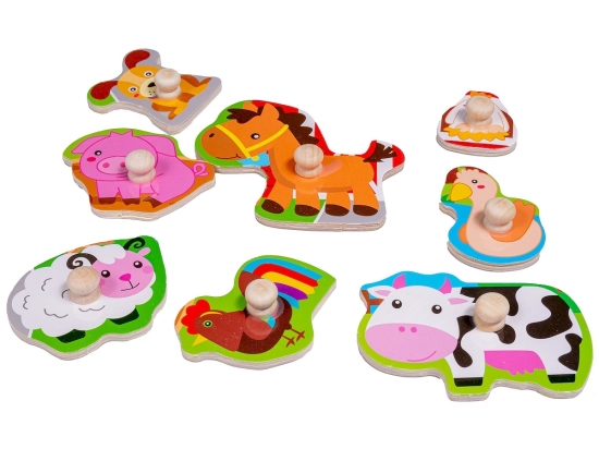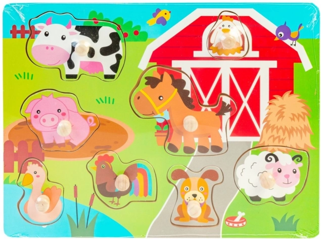 Houten puzzel met afbeeldingen van dieren, ideaal om de namen en het uiterlijk van dieren die op het platteland leven te leren kennen.