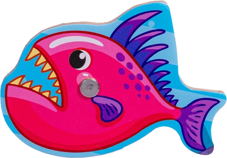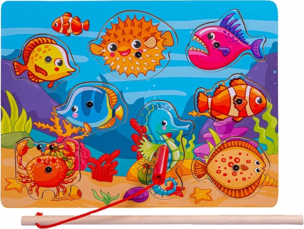 Houten puzzel, vissenpuzzel met magneten en een hengel.