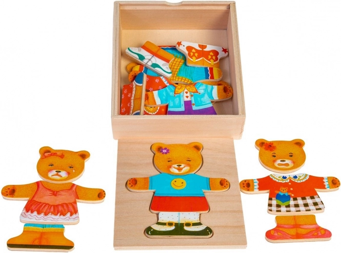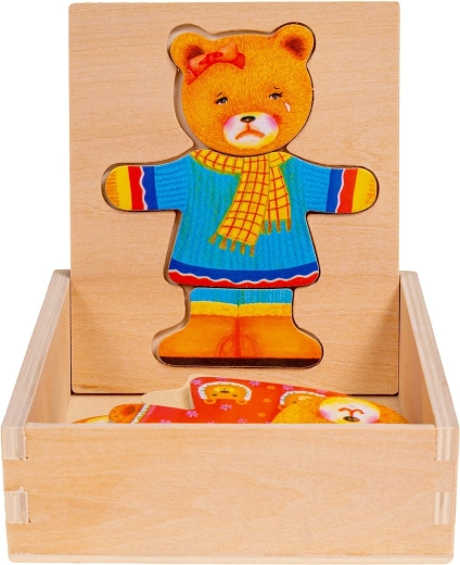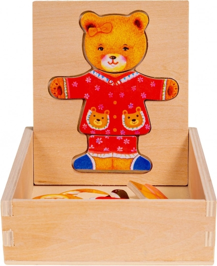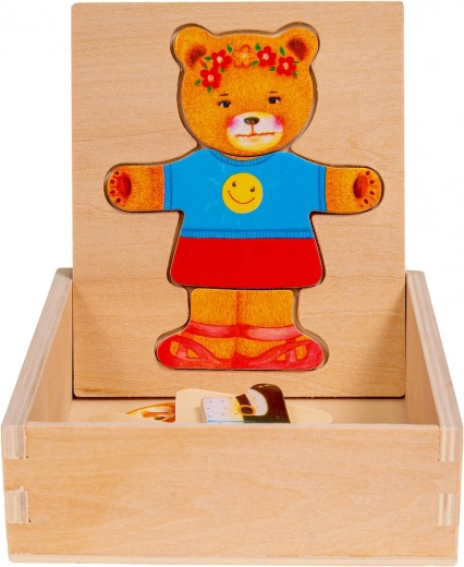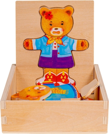 Houten puzzel beer meisje is een kleurrijke puzzelset die het mogelijk maakt om kleding en emoties van de beer te veranderen, wat de creativiteit en motorische vaardigheden van kinderen stimuleert.