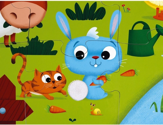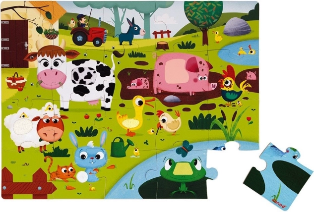 Kinderpuzzel van JANOD met dieren op de boerderij. Sommige stukjes hebben een speciale afwerking met een textuur die kenmerkend is voor echte dieren. De puzzel stimuleert logisch denken, aandacht en het geheugen van kinderen. Met de puzzel leren ze kleuren, vormen en objecten herkennen, ontwikkelen ze de handmotoriek en leren ze de relatie tussen delen en het geheel begrijpen. Dankzij de speciale stukken in de puzzel leren kinderen met de tast verschillende structuren waarnemen. Afmeting van de gelegde puzzel ca. 65 x 50 cm
