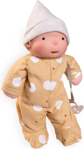 Hoofd van 100% siliconen, vulling van gerecyclede PET-vezels en kleding van bio-katoen zonder chemische behandeling.
