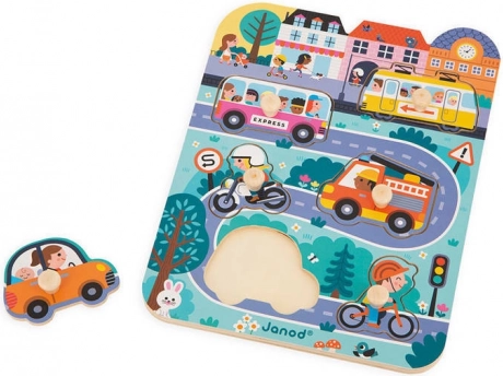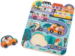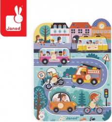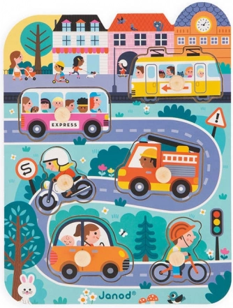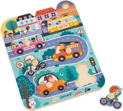 De houten puzzel In de stad van Janod biedt een gemakkelijke en leuke manier voor kinderen om kennis te maken met verschillende vervoermiddelen. Deze set bevat 7 stukjes: een tram, bus, motor, fiets, personenauto en brandweerwagen, allemaal op een houten bord met een stedelijke scène.