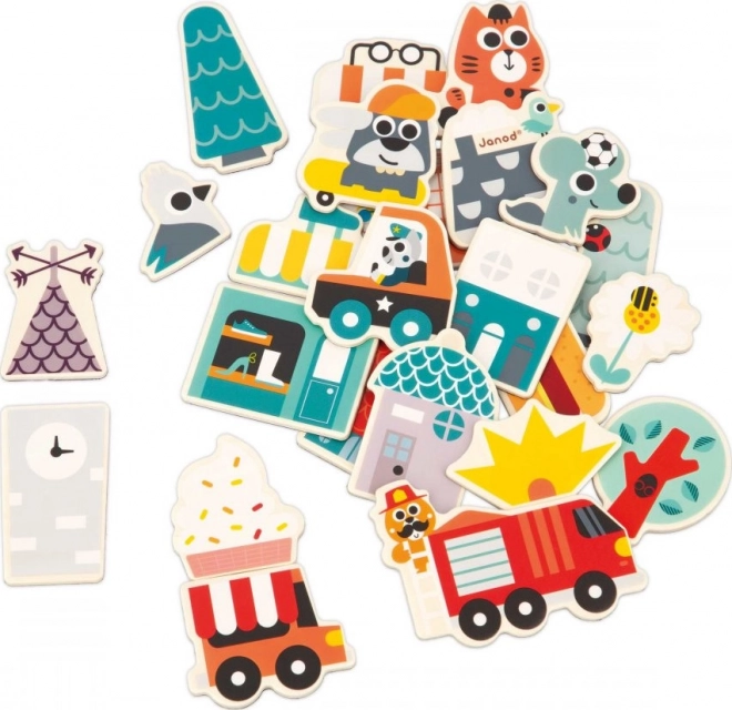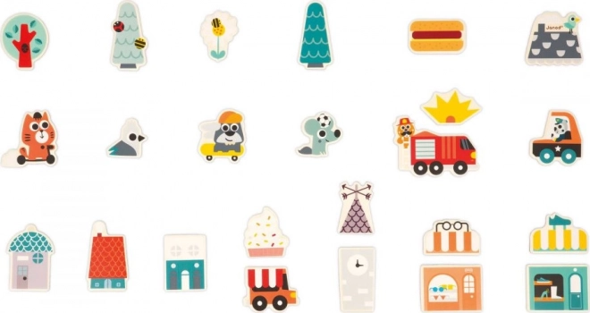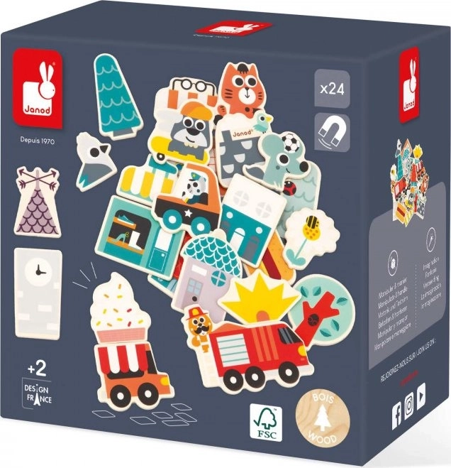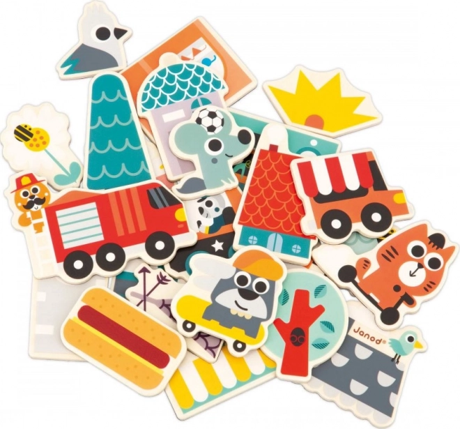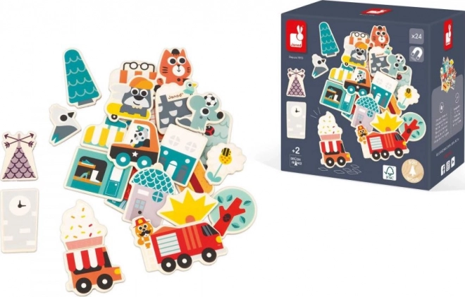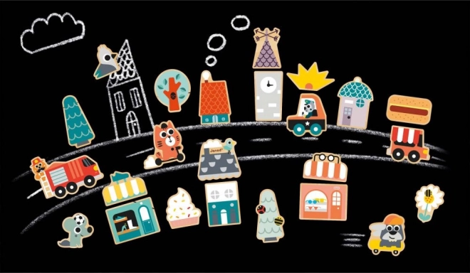 Met deze set van 24 houten magneten kun je bouwen op alle magnetische oppervlakken! De set kindermagneten bevat naast een step en een skateboard ook magneten met voertuigen (brandweerauto, politieauto, foodtruck) en elementen om winkels en huizen te bouwen, zodat deze door vrolijke dieren bewoonde stad kan bloeien. Je kunt de magneten mixen en zo veel verschillende combinaties maken.