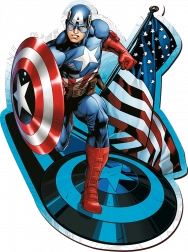 De dynamische illustratie met een held in rood-blauwe tricolore-stijl en een sterrenschild geeft het leggen energie en de sfeer van de stripwereld.