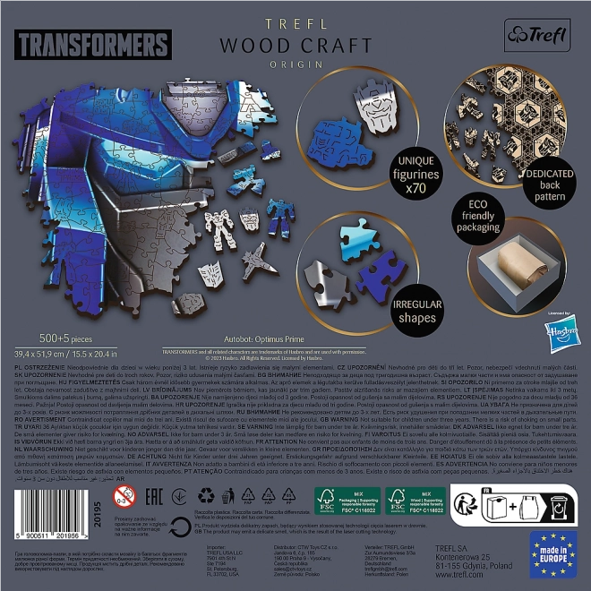 De premiumlijn TREFL Wood Craft Origin biedt een uitzonderlijke puzzelervaring dankzij hoogwaardige materialen en een precieze lasersnede. Het motief van de legendarische held OPTIMUS PRIME zal zowel TRANSFORMERS-fans als veeleisende puzzelaars aanspreken die op zoek zijn naar ongewone vormen en perfect passende stukjes.