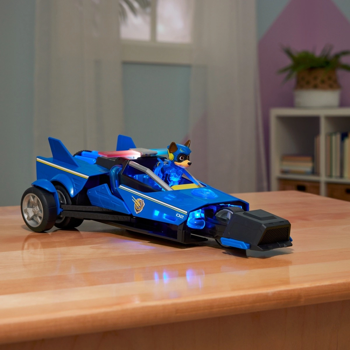 Ga op missie met heldenpup Chase en zijn politiewagen uit de film PAW Patrol: De Megafilm. Dit grote voertuig van meer dan 30 cm biedt lichteffecten, geluiden en muziek uit de film en een indrukwekkende transformatie naar reddingsmodus. Inclusief Chase-figuur, batterijen zijn bijgesloten – uitpakken en spelen maar.