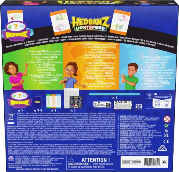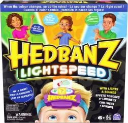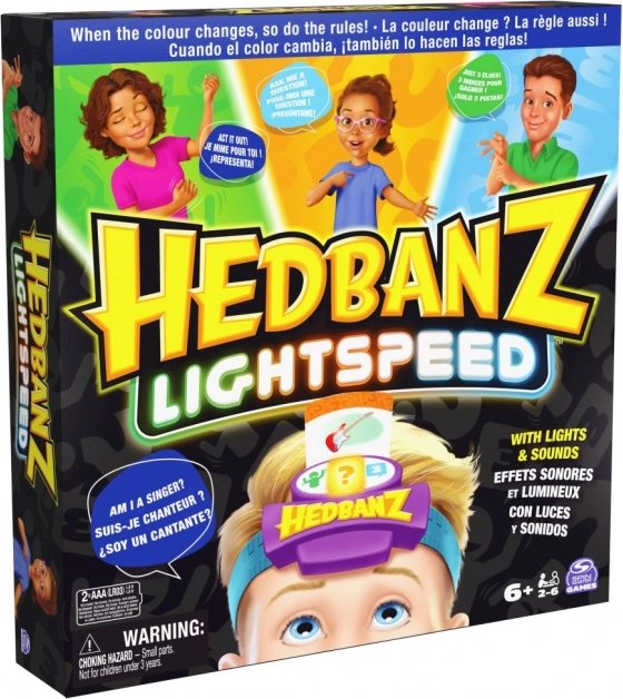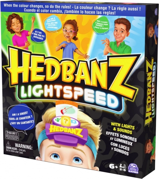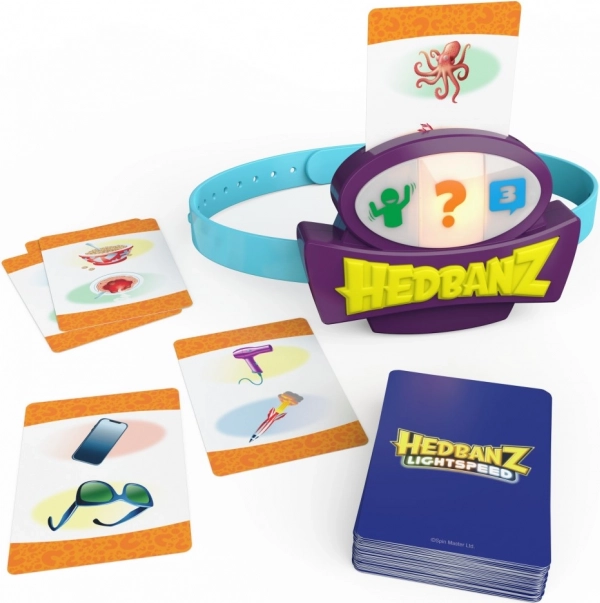 Geniet van het spannende spel Hedbanz Lightspeed, waar de regels voortdurend veranderen dankzij de dynamische elektronische hoofdband met drie kleuren. Beeld een scène uit, antwoord in een flits of gebruik drie hints afhankelijk van de kleur die de hoofdband toont.