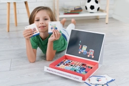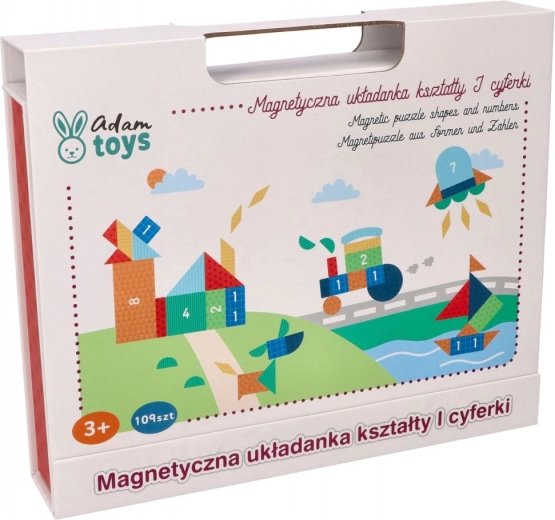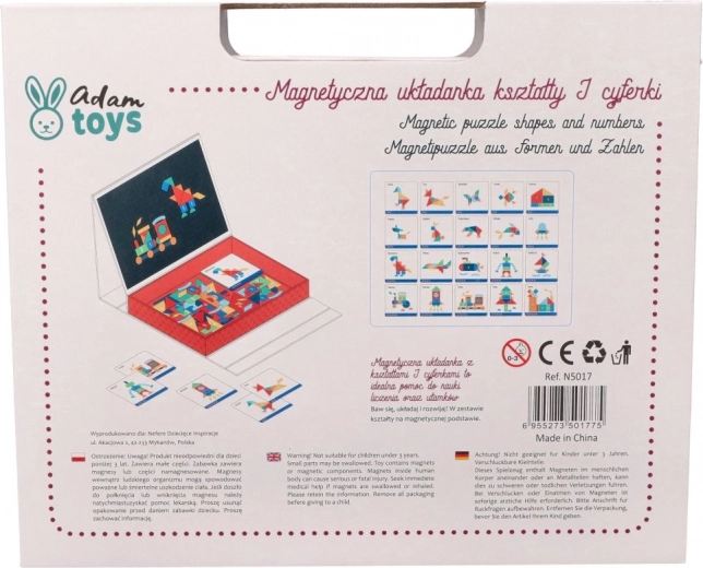 Praktische magnetische puzzel in de vorm van een opvouwbaar bord met maar liefst 109 magnetische elementen, waarmee kinderen spelenderwijs vormen en cijfers oefenen. Bevat een gelijnd bord, 20 kleurrijke voorbeeldkaarten en tal van stukjes in verschillende groottes en vormen voor eindeloze legvarianten, thuis en onderweg.