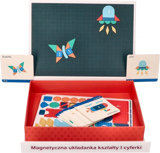 Ontdek een slimme educatieve speelgoedset die de fijne motoriek, het logisch denken en de verbeelding stimuleert. Kinderen leggen figuren van magnetische puzzelstukken – vierkanten, driehoeken, cirkels, ruiten en andere vormen; veel onderdelen zijn voorzien van cijfers 1–9 voor de eerste stapjes in wiskunde. De compacte uitvoering in de vorm van een koffertje met handvat is ideaal voor plezier thuis en op reis.